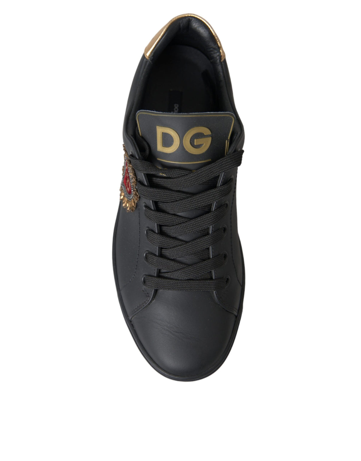 Dolce & Gabbana Black Leather Heart Embellished Sneakers Shoes